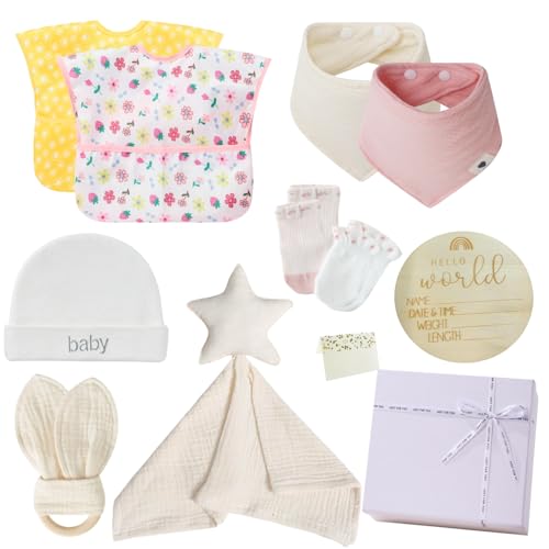 スリーマッシュルームの出産祝いギフトセットは、女の子向けの12点セット。ガーゼハンカチ、スタイ、おくるみ、帽子、靴下、手袋が含まれ、ギフトBOX付きで贈り物に最適です。