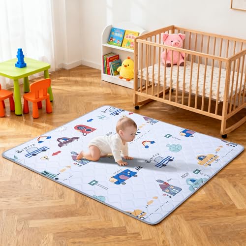 BQKOZFIN プレイマットは180x200x2cmの大判サイズで、厚さ2cmの極厚設計。安全素材で滑り止め機能付き、赤ちゃんや子供に最適な防音マットです。折りたたみ可能で、車の図案が可愛い一枚入り。
