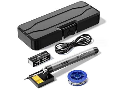 充電式のコードレスはんだごて。温度調整300〜450℃可能。電子作業や家電修理に最適。ポータブルで使いやすく、充電ケーブル付き。グレー色。