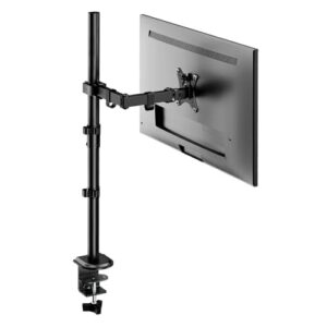 イーサプライのモニターアームポールは、簡単に高さ調整が可能で、回転機能もあり、デスク上のスペースを有効活用。最大約27インチのモニターに対応し、安定した設置が特徴です。