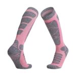 厚手のスノーボード・スキーソックス。抗菌防臭、吸汗・速乾、保温が特徴。段階着圧設計で通気性も良好。暖かく防寒に適し、秋冬用の登山にも最適。膝丈のレディースサイズ、ピンク色。