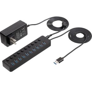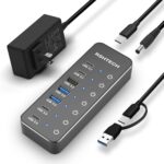 RSHTECHのUSBハブは、10Gbpsの高速接続を提供する7ポート(USB-C×4、USB-A×3)を備え、セルフおよびバスパワー対応。タッチスイッチ付きで、アルミ合金ボディで高耐久性を誇ります。ACアダプタ(100cm)付き。