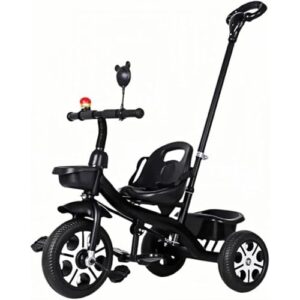 2~7歳向けの軽量な子供用三輪車。プッシュバー付きで、リアフレームとペダルが特徴。組立簡単、折りたたみ式ペダル、安全ベルトシート、滑り止めあり。屋内外で使える乗用玩具。