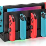 Switch有機EL用のジョイコン充電スタンド。6台同時急速充電が可能で、ドック収納一体型。LED指示ランプ付き、USBケーブル内蔵。Joy-Con 2には対応していません。