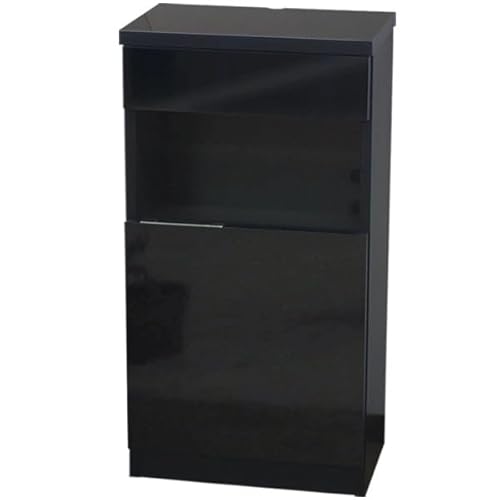 幅45cm、奥行29.5cmの電話台・ファックス台。完成品で、シンプルなデザインの木製スリムキャビネット。モデムやルーター収納にも最適。大容量の引き出し付き。おしゃれなブラック鏡面仕上げ。
