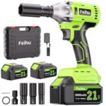 Feihuの電動充電式インパクトレンチは、18V、320N·mの高トルクを誇るブラシレスモーターを搭載。自動停止機能や無段変速、LEDライト、軽量設計でタイヤ交換に最適。3000mAhバッテリー2個付き。正逆転両用でPSE認証済。