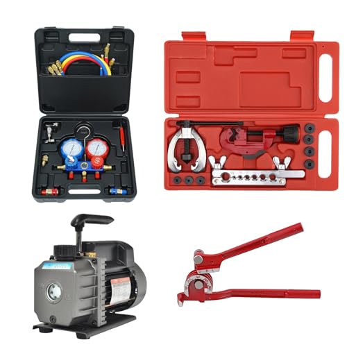 エアコン修理4点セットは、角型ケースに収納された便利なツールが揃っています。主な内容は、冷媒チャージ、真空ポンプ、圧力計、配管ツール。初心者でも簡単にエアコンのメンテナンスが可能です。
