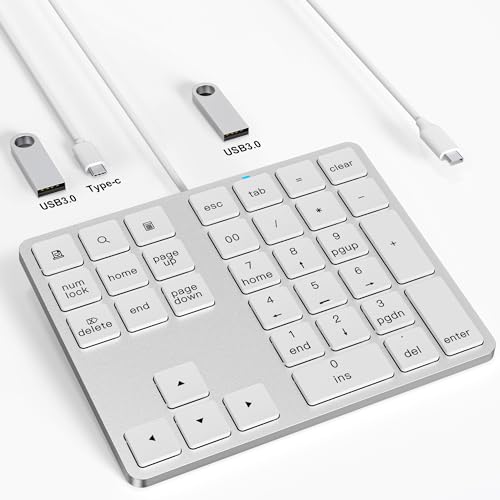 有線薄型34キーのMac用テンキーボード。Tabキー付きで、Type-C接続。2つのUSB 3.0ポートと1つのUSB Cポート搭載。PC、Laptop、iOS、Android対応の多機能ナンバーパッド(ホワイト)。