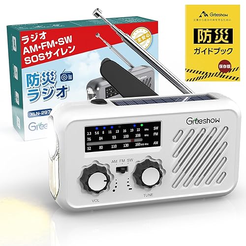 Greeshow 防災ラジオ GS-297は、SW/AM/FM受信の多機能手回しラジオです。SOSアラート、ソーラー充電、2000mAhバッテリー搭載。防水性で、小型・軽量、USB充電対応、スマホ充電も可能です。LEDライト、3.5mmイヤホンジャック付き。防災ガイドブック付属。