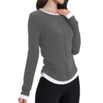 ヨガウェア レディース 長袖のスリムフィットトップス。ピラティスやトレーニング、ランニングに最適。速乾性素材で冬の運動にも対応。カラーはグレー、サイズはL。