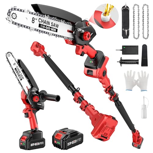 2025新型 Supstable 高枝電動チェーンソー。8インチブラシレス、充電式、2役対応。4.0Ahバッテリー、軽量、130-250cm伸縮。角度調節可能、自動給油。プロ用木工切断、日本語説明書付き。