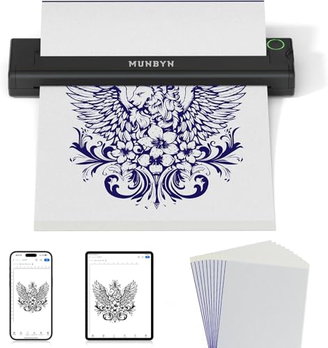 MUNBYNサーマルプリンターITP05は、タトゥー用紙10枚付きのモバイルプリンターです。Bluetooth接続に対応し、Android、iOS、PCと互換性があります。初心者からプロのアーティストまで活用できます。
