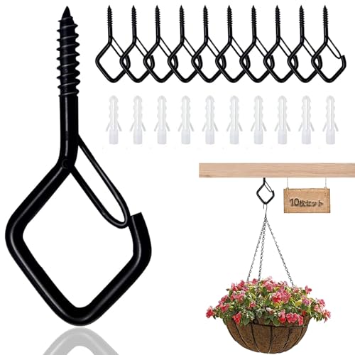 炭素鋼製のフックネジ(直径55mm)は、天井や壁に取り付け可能。プラスチック拡張ピン付きで簡単設置。安全バックルデザインが特徴で、10個入り。ライトや植物、台所用品の吊り下げに最適。