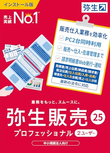 弥生販売 25 プロフェッショナル 2ユーザーは、インボイス制度に対応した業務支援ソフトです。使いやすいインターフェースと多機能で、請求書や見積書の作成が簡単に行えます。