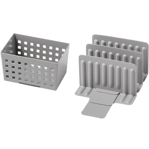 ライクイットのキッチン収納アイテムで、スライド式の冷凍庫収納スタンドです。約幅16.5x奥13x高10.5cmの仕切りと、約幅18x奥11.5x高10.5cmのボックスが連結可能。グレー色で日本製、冷凍食品を立てて収納できます。