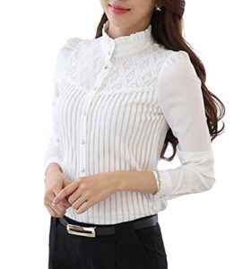 [Bolan Verl] レース ブラウス レディース 長袖 ワイシャツ ストライプ シャツ カジュアル ビジネス 通勤 オフィス Yシャツ 黒 白 事務服 OL 厚手 春 秋 冬 立ち襟 3XL