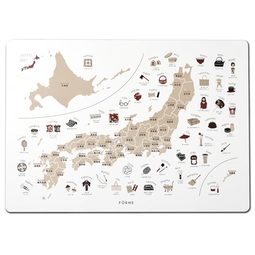 FÖRNEの日本地図ポスターはB3サイズで、お風呂でも使える耐水性合成紙を使用。工芸品イラストが魅力的で、デザイン性と実用性を兼ね備えたアイテムです。