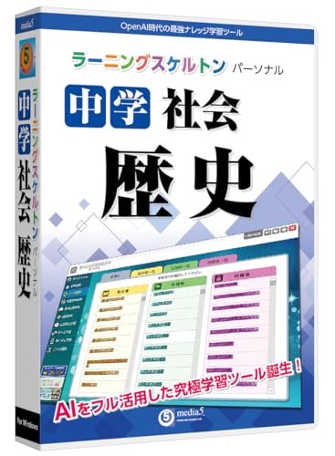 media5 ラーニングスケルトンパーソナル 中学社会 歴史は、Windowsに対応した教育ソフトで、中学生向けの歴史学習をサポートします。インタラクティブな教材で、興味を持たせる内容が特徴です。