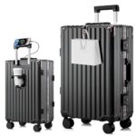 Tatsuiのスーツケースは、大容量で機内持ち込み可能。アルミフレームタイプで耐衝撃設計。ストッパー、USBポート、カップホルダー、隠しフック機能を備え、軽量で静音。360度回転キャスター付きで、旅行やビジネスに最適です。