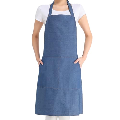 コージーキューブのデニムエプロンは、男女兼用で作業や料理に最適。厚手綿キャンバス製でお洒落なデザイン。長さ調整可能なH型の首掛けタイプ、ポケット付きで便利。シワになりにくく、カフェ風のシーンにぴったり。