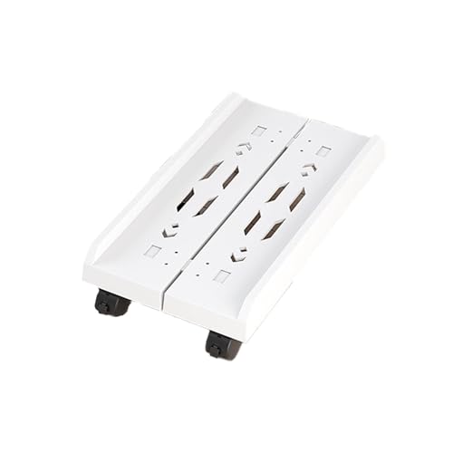 幅調整可能なPCスタンド。デスクトップPCを置くための便利なワゴン。落下防止機能付きで、会社や自宅での移動も楽々。カラーは白で、オフィスに最適。