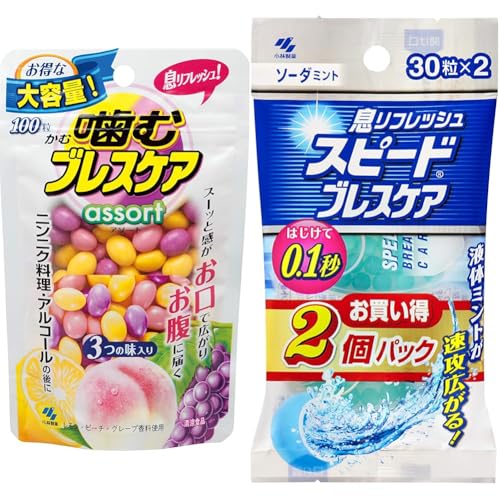 噛むブレスケアは、アソートパウチに100粒入りで、様々なフレーバーが楽しめます。スピードブレスケアは、プチッと瞬間に息をリフレッシュできるソーダミント味の30粒入り2個パックです。