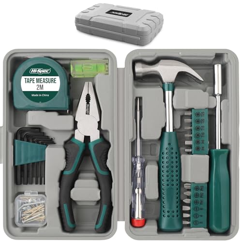 Hi-Spec 25点工具セットは、家庭用DIYや車・バイク修理に最適な便利なツールキットです。初心者向けで、ハンマーやドライバーが含まれたグリーンの工具箱です。