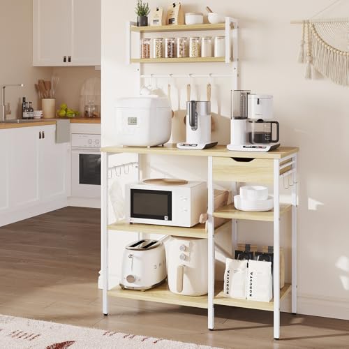 Bestierレンジラックは幅90cmで、大型レンジ対応のキッチンラックです。引き出しと高さ調整可能な可動棚2枚があり、高耐荷設計。高さは147.8cm、10個のS字フックとアジャスター付き。オーク色の食器棚兼レンジボードとして最適です。
