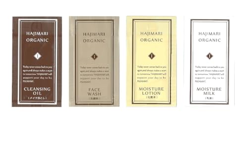 ハジマリ オーガニックの4種アソートは、メイク落とし、洗顔料、化粧水、乳液の使い切りパウチ(各3ml)が各5点ずつ、計20点入り。手軽にオーガニックケアを体験できるセットです。