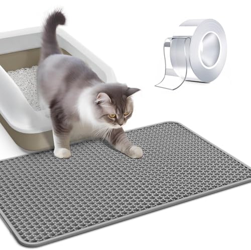 猫砂飛び散り防止トイレマット。防水・防カビ仕様で、滑り止め付き。掃除も簡単で、両面ゲルテープで固定可。サイズは75cm×58cm、色はグレー。
