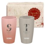 名入れ可能なペアタンブラーギフトボックスセット。340mlの真空断熱タンブラーは保温・保冷に優れ、ローズベージュとアッシュグレーのカラー展開。記念日や特別な日のプレゼントに最適です。
