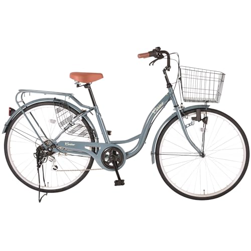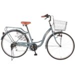 Carinoのシティサイクル26インチ、ママチャリスタイル。シマノ6段変速、LEDライト搭載。カゴ付きで通勤や通学に最適。また、リアキャリアも装備された軽快車。カラーはブルーグレーです。