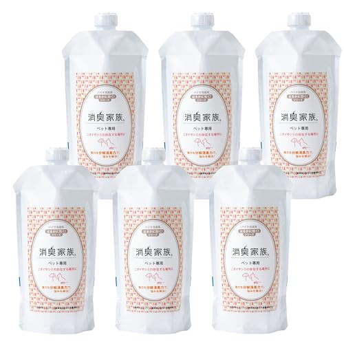 消臭家族 バイオ消臭剤 ペット用は、犬猫のトイレの尿臭対策に最適。香りでごまかさず、強力な分解消臭力で最大98%消臭。330ml×6本の詰め替え用。