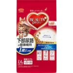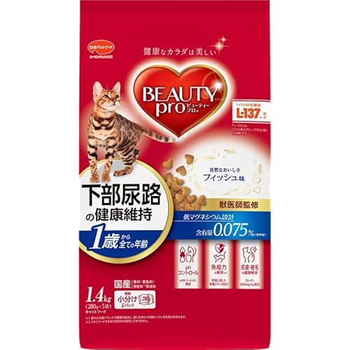 日本ペットフードのビューティープロキャットは、下部尿路の健康を維持するために特別に設計されたキャットフードです。1歳以上の猫に最適で、1.4kg(280g×5袋入)×8袋のケースで提供されます。