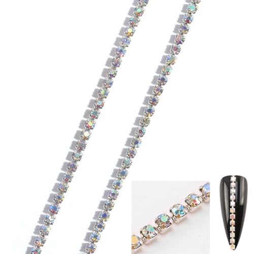 オーロラカラーの1.5mmチェーンラインネイルパーツ。25cmの長さで、クリスタルガラスストーンやチャームと組み合わせて使用可能。ハンドメイドやDIYに最適な装飾素材です。