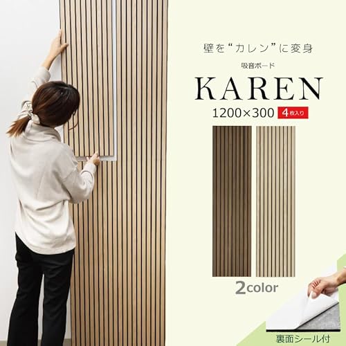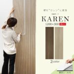 寛廉 KAREN 吸音ボードは、ベージュ色のリブボードで、サイズ1200mm×300mmの4枚がセットで1.44㎡をカバー。防音効果があり、アクセントウォールとしても使用可能。おしゃれなホテルライクな空間作りに最適なDIY壁材です。
