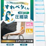 LIXIAの圧縮袋は、座るだけで約5秒で圧縮可能。旅行や収納に最適で、シワを軽減しながら簡単に圧縮できる。Mサイズ5枚とLサイズ5枚のセット。じゃらん掲載、収納のプロ監修。