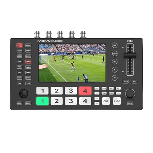 MOVMAGIC M4Sは5.5インチの5CHマルチカメラビデオミキサースイッチャーです。2HDMI(4K/60P)入力、USB 3.1ストリーム、PTZ/SD対応で、HDMI/SDIも4個。LANとUSB入力も搭載。