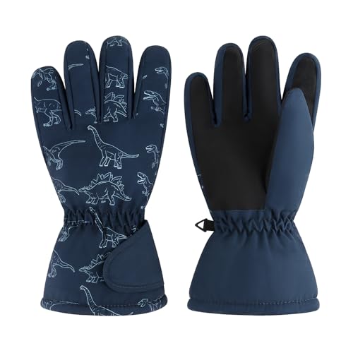 スキーグローブは、防寒性に優れた5層断熱と撥水防風仕様。滑り止め加工で安定感抜群。裏起毛で暖かく、子どもに最適。サイズM(3-6歳)、ネイビー恐竜柄。スノーボードや遊び、通学にぴったり。