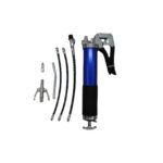 グリースガンは手詰めとカートリッジ兼用のレバータイプで、ロックカプラーと注油ホースが付属しています。青色のデザインが特徴で、効率的な注油作業をサポートします。