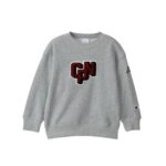 チャンピオンのキッズ用長袖スウェットシャツ。コットン100%のフレンチテリー素材で柔らかく、丸首デザイン。ロゴ刺繍とグラフィックワッペン付き。カジュアルなスタイルに最適。