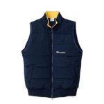 チャンピオンのジップベストは、丸首デザインでラバープリントが特徴。ダブルスライダージッパーで着脱が容易。カジュアルなスタイルに最適なメンズゴルフウェア、C3-CG602-370-L。