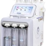 自宅で使用可能な多機能ハイドラフェイシャルマシン。酸素と水素を活用し、皮膚状態を改善。高性能で、サイズは45.5 x 42.5 x 30 cm、カラーはグリーンとグレーあり。
