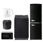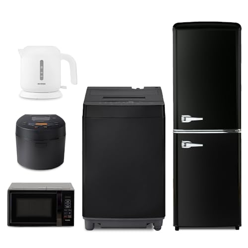 アイリスオーヤマの新生活応援家電5点セット。130L冷凍冷蔵庫、6kg洗濯機、17L電子レンジ、3合IH炊飯器、800ml電気ケトルが揃ったブラック&ホワイトのスタイリッシュなアイテムです。一人暮らしに最適。