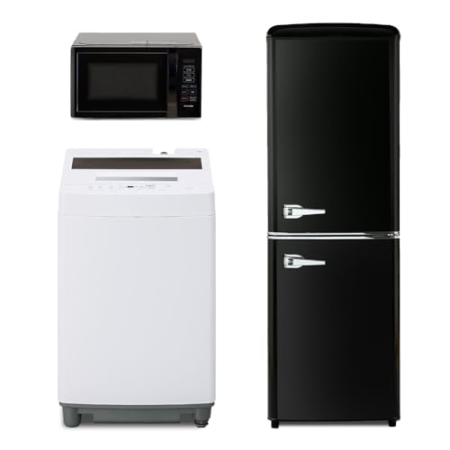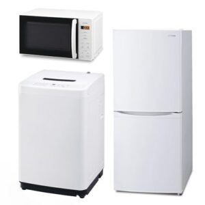 【アイリスオーヤマ 家電3点セット】冷凍冷蔵庫130L(ブラック)、洗濯機7kg(ホワイト)、電子レンジ17L(ブラック)。一人暮らしに最適なコンパクトで使いやすいセットです。新生活にぴったり!