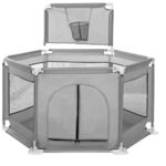 大型のメッシュベビーサークルで、赤ちゃんや子供の遊び場に最適。バスケットゴール付き、組立式でドアもあり、室内外で使えます。滑り止め機能付きで堅固な設計。