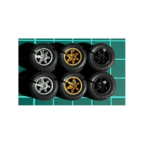 1/64スケールのカスタムホイール3台分で、SUV用オフロードタイヤがセットされています。シルバー、ゴールド、ブラックのデザイン。約14.0ミリのサイズで、ミニカー向けの並行輸入品です。