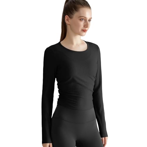 MORGEN SKYのレディース長袖Tシャツ。Uネックデザインでサイドギャザー付き。吸汗速乾で通気性抜群、フィットネスやヨガに最適。スタイリッシュなブラック、Lサイズ。