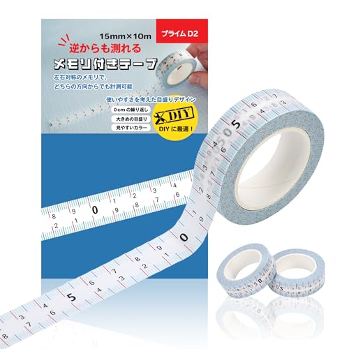 逆からも測れる目盛り付きのマスキングテープ3本セット。メジャーや巻尺、定規として使え、DIYや作業に最適。サイズは15mm×10m、カラーはホワイトです。