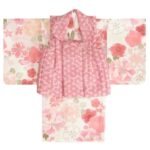 KAGURAのベビー着物は、赤ちゃん用の女の子向けで、ベージュピンク地に小桜デザイン。ピンク色の被布と二部式仕様により、楽々着せ付けが可能です。